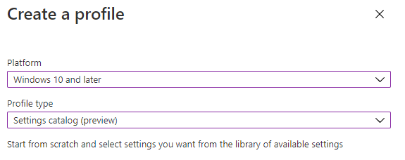 - Select Windows 10 and later as the Platform and Settings catalog (preview) as the Profile type. Then click on Create.
