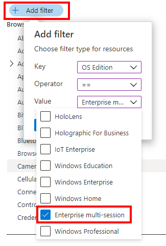 - Add the following filter in the settings picker to get only the supported settings for Windows 10/11 Enterprise multi-session.