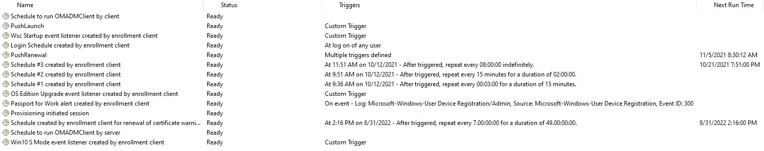 As Administrator, you will find many Schedule Tasks for the MDM Synchronization under Microsoft > Windows > EnterpriseMgmt > GUID in the Task Scheduler. In addition, it is shown at which times the sync is executed automatically (Schedule #1 to #3).