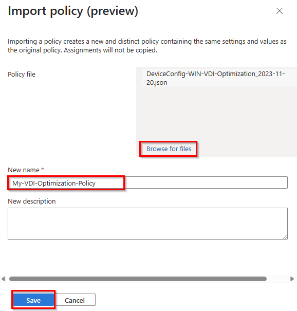 Select the policy template file (JSON), e.g. DeviceConfig-WIN-VDI-Optimization_2023-11-20.json, and enter a name for your new device configuration profile, then click Save.