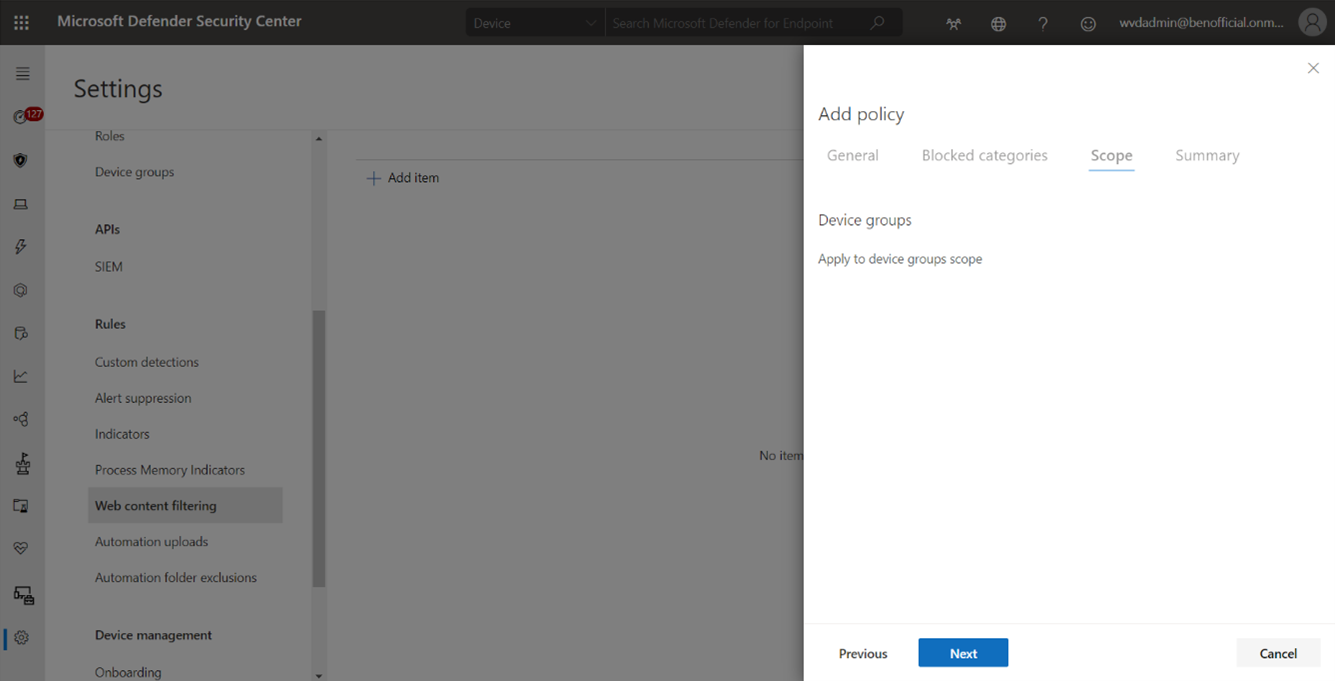 - Specify the policy scope. Select the device groups to specify where to apply the policy. Only devices in the selected device groups will be prevented from accessing websites in the selected categories.