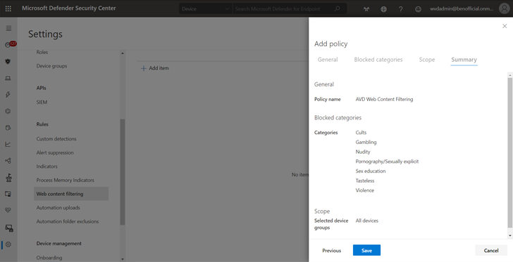 Web content filtering policies specify which site categories are blocked on which device groups. To manage the policies, go to Settings > Rules > Web content filtering.
